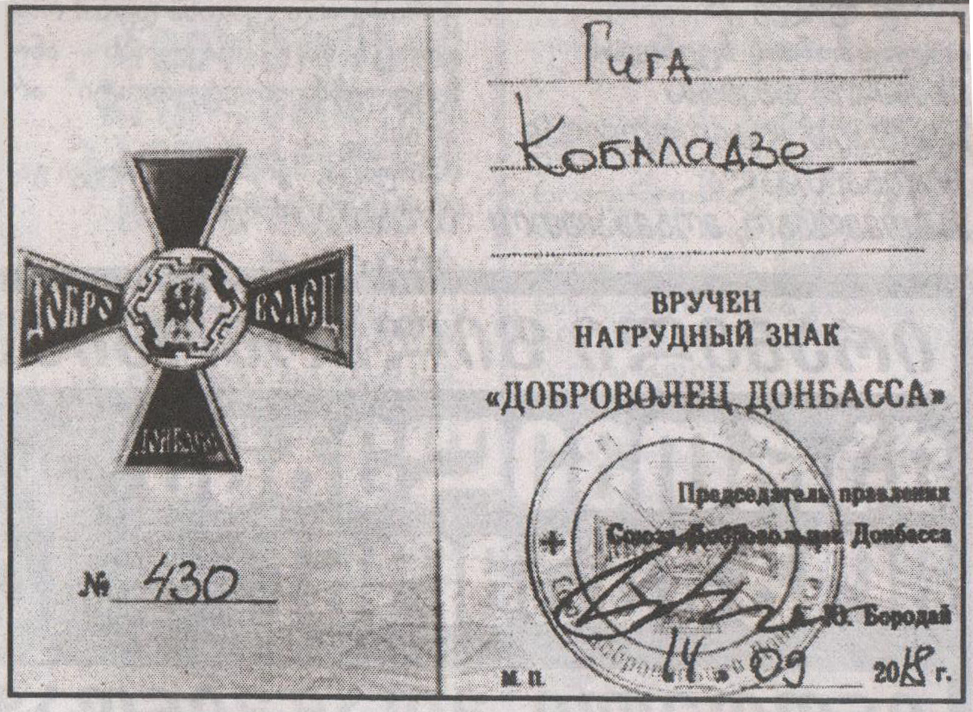 კერძოდ, „დონბასის მოხალისეთა კავშირმა“, რომელიც რუსული ბანდფორმირების ლიდერმა ალექსანდრე ბოროდაიმ 2015 წელს ჩამოაყალიბა, გიგა კობალაძეს ამ ორგანიზაციის წევრობის დამადასტურებელი მოწმობა N10251 და სამკერდე ჯვარი გადასცა.