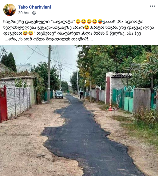 “სიგრძეზე დაგებული ”ასფალტი” ვაააახ ,რა იდიოტი ხელისუფლება გვყავს-სიგანეზე არაო. მარტო სიგრძეზე დაგვავალეს დაგებაო.” ოცნებავ” ისაუბრეთ ახლა მიშას 9 წელზე, აბა ჰეე ….არა, ეს ხომ უნდა მოგივიდეს თავში?!….“
