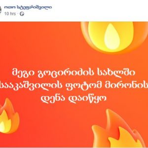 საზოგადოება “მეგი გოცირიძის სახლში სააკაშვილის ფოტომ მირონის დენა დაიწყო” 30.09.2019 13:21:46 ShareTweetSharePin სააკაშვილის გუშინდელ სატელევიზიო ეთერს სოციალურ ქსელში დიდი გამოხმაურება მოჰყვა. გთავაზობთ ჟურნალისტ ოთო სტეფანიშვილის სტატუსს. “მეგი გოცირიძის სახლში სააკაშვილის ფოტომ მირონის დენა დაიწყო” კომენტარები ShareTweetSharePin ნანახია: 1493 ჯერ