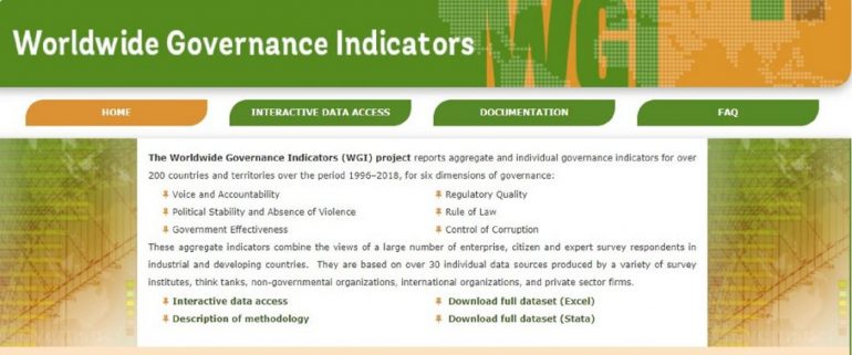 გლობალური მმართველობის ინდიკატორებით მსოფლიოს მასშტაბით ფასდება 214 ქვეყანა და ტერიტორია, მათ შორის მსოფლიო ბანკის წევრი 189 სახელმწიფო. კვლევა მოიცავს პერიოდს 1996 წლიდან 2018 წლის ჩათვლით.