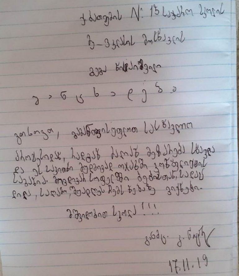 „გთხოვთ, გამანთავისუფლოთ სასწავლო პროცესიდან, რადგან ძალიან მეზარება სწავლა და ეს საკითხი, მუდმივად, ოჯახში კონფლიქტის საგანია. მივდივარ სოფელში, ბებიასთან, სადაც დილა, საღამო, შუადღეს ჩემს ნებაზე ვიქნები“, – წერს ბავშვი.