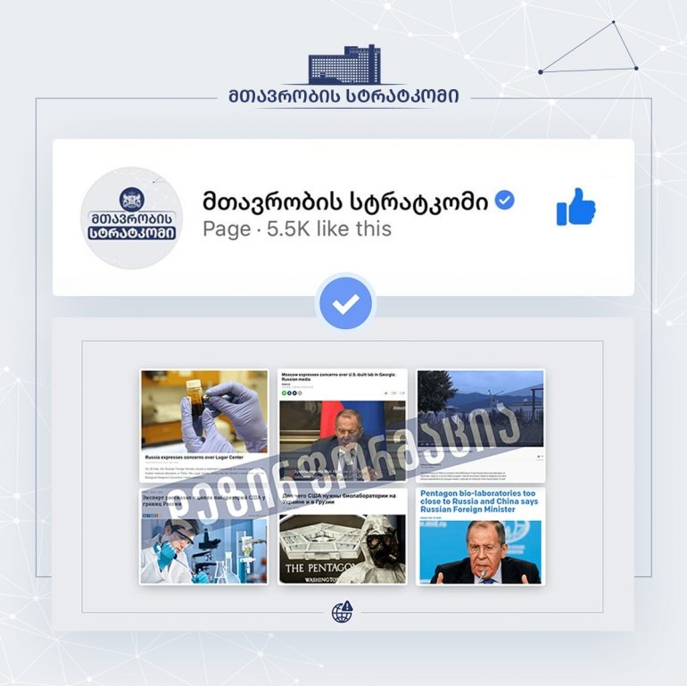 „საქართველოს მთავრობამ „ფეისბუქის“ გვერდი „მთავრობის სტრატკომი“ შექმნა https://www.facebook.com/GovernmentStratCom/, რომლის მიზანია მედიასაშუალებებით და სოციალური ქსელით გავრცელებული ყალბი ახალი ამბების გამოვლენა და სტრატეგიული კომუნიკაციების შესახებ საზოგადოების ინფორმირების გაზრდა.