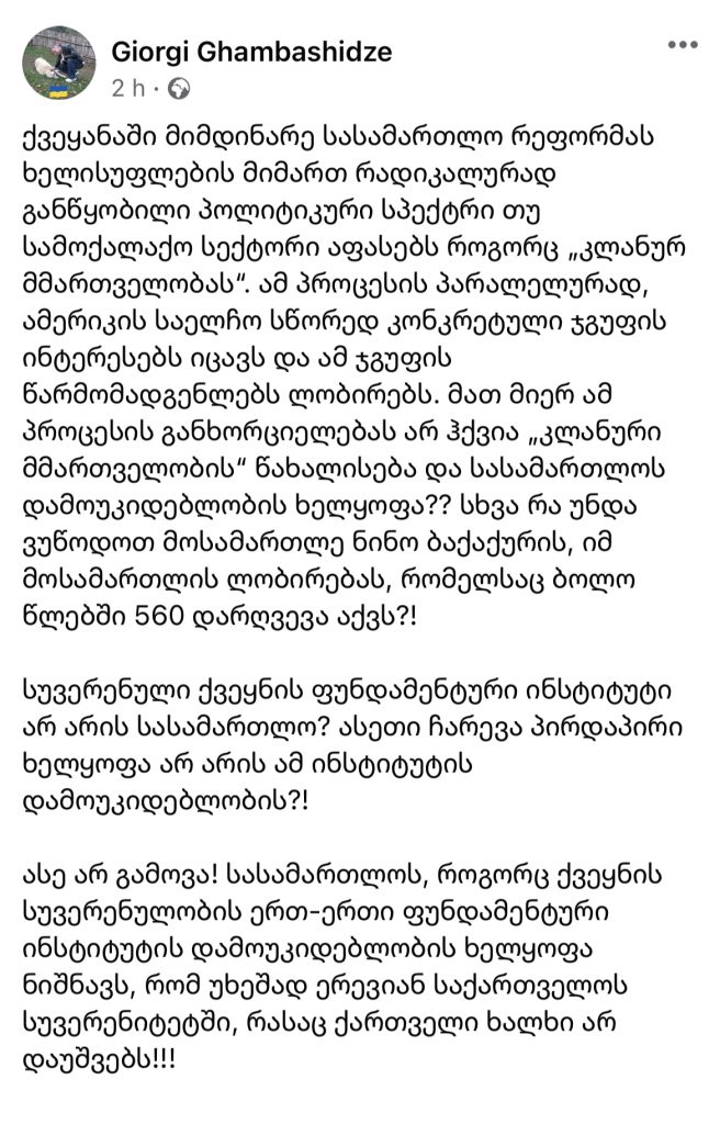სასამართლოს, როგორც ქვეყნის სუვერენულობის ერთ-ერთი ფუნდამენტური ინსტიტუტის დამოუკიდებლობის ხელყოფა ნიშნავს, რომ უხეშად ერევიან საქართველოს სუვერენიტეტში, რასაც ქართველი ხალხი არ დაუშვებს – წერს სოციალურ ქსელში მოძრაობა „ხალხის ძალის“ წევრი“ გიორგი ღამბაშიძე.