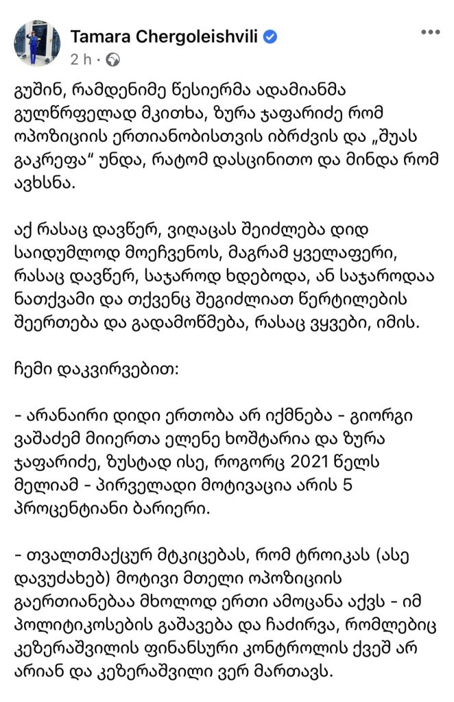 „ტაბულას” რედაქტორი თამარ ჩერგოლეიშვილი სოციალურ ქსელში აქვეყნებს ვრცელ პოსტს, სადაც საუბრობს ზურა ჯაფარიძის ინიციატივაზე პარტიების გაერთიანების შესახებ.