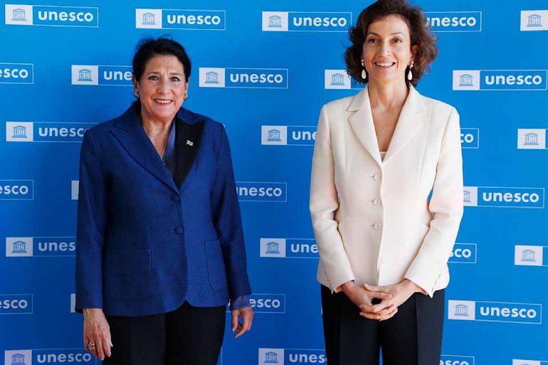 პრეზიდენტმა კვლავ დააყენა საკითხი, იუნესკო-მ განიხილოს, როგორ შეიძლება იზრუნოს და განსაკუთრებული ადგილი მიუჩინოს კავკასიურ ენათა ოჯახის ენებს. სალომე ზურაბიშვილმა იუნესკო-ს გენერალური დირექტორი საქართველოში ქალთა საერთაშორისო კონფერენციაში მონაწილეობისათვის მიიწვია, რომელიც პრეზიდენტის ინიციატივით თბილისში უკვე მეორედ ჩატარდება. შეხვედრისას პრეზიდენტი და გენერალური დირექტორი შეთანხმდნენ, რომ საქართველო გააგრძელებს იუნესკო-სთან თანამშრომლობას ბიოლოგიური მემკვიდრეობისა და ბიომრავალფეროვნების დაცვის, შენარჩუნების მეთოდოლოგიის გაუმჯობესების მიმართულებით“, – აღნიშნულია ინფორმაციაში, რომელსაც საქართველოს პრეზიდენტის ადმინისტრაცია ავრცელებს.