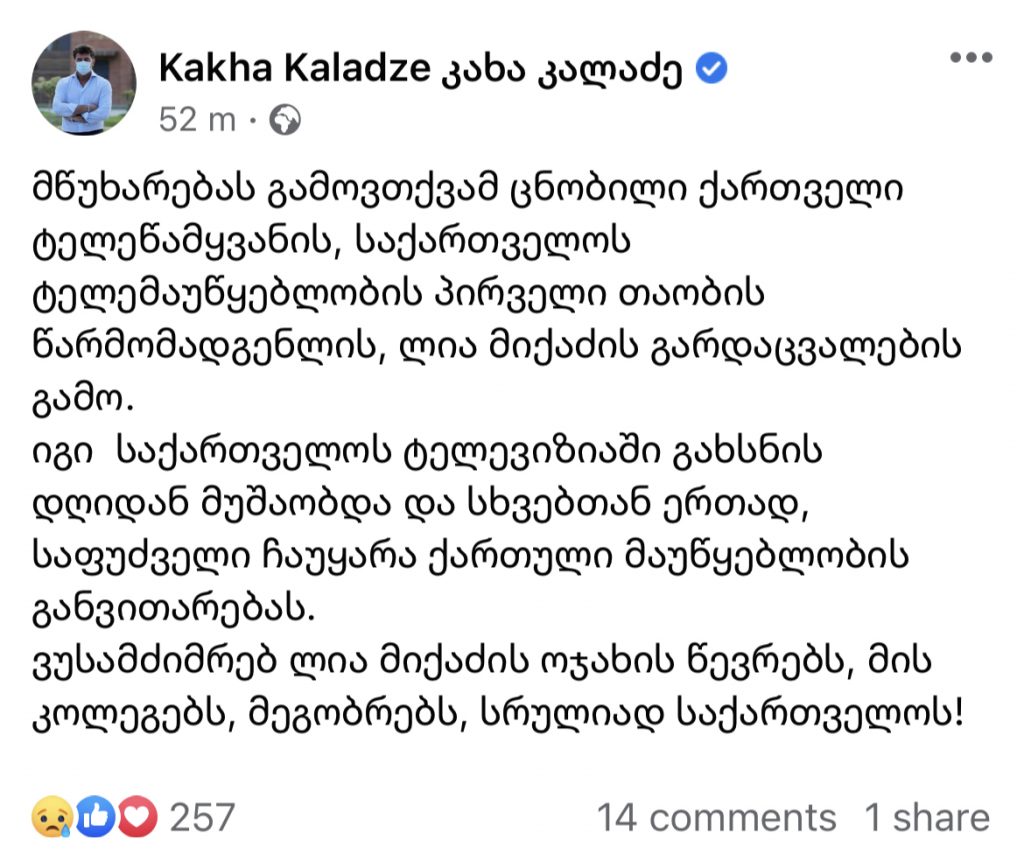 „მწუხარებას გამოვთქვამ ცნობილი ქართველი ტელეწამყვანის, საქართველოს ტელემაუწყებლობის პირველი თაობის წარმომადგენლის, ლია მიქაძის გარდაცვალების გამო.