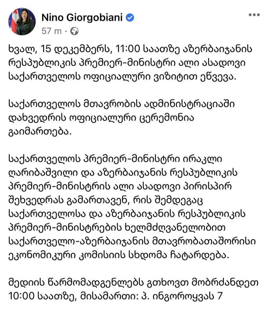 “ხვალ, 15 დეკემბერს, 11:00 საათზე აზერბაიჯანის რესპუბლიკის პრემიერ-მინისტრი ალი ასადოვი საქართველოს ოფიციალური ვიზიტით ეწვევა.
