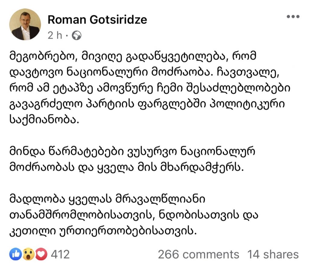 “მეგობრებო, მივიღე გადაწყვეტილება, რომ დავტოვო ნაციონალური მოძრაობა. ჩავთვალე, რომ ამ ეტაპზე ამოვწურე ჩემი შესაძლებლობები გავაგრძელო პარტიის ფარგლებში პოლიტიკური საქმიანობა.