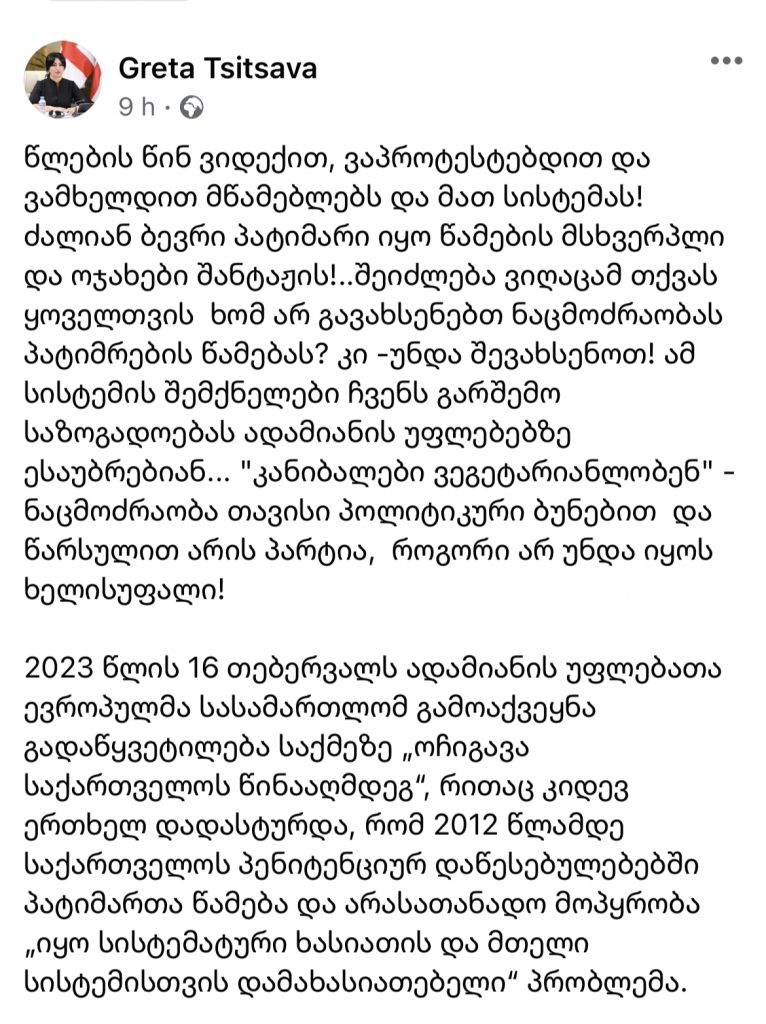 შეიძლება ვიღაცამ თქვას ყოველთვის ხომ არ გავახსენებთ ნაცმოძრაობას პატიმრების წამებას? კი -უნდა შევახსენოთ! ამ სისტემის შემქნელები ჩვენს გარშემო საზოგადოებას ადამიანის უფლებებზე ესაუბრებიან… “კანიბალები ვეგეტარიანლობენ”, – ასე ეხმაურება პარლამენტის წევრი გრეტა წიწავა სოციალურ ქსელში ადამიანის უფლებათა ევროპული სასამართლოს მიერ გამოქვეყნებულ გადაწყვეტილებას საქმეზე „ოჩიგავა საქართველოს წინააღმდეგ“.