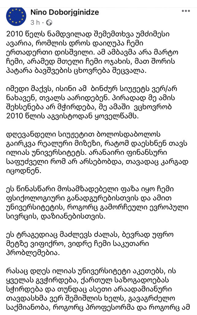 “ილიას სახელმწიფო უნივერსიტეტის“ რექტორი ნინო დობორჯგინიძე სოციალურ ქსელში განცხადებას ავრცელებს. რექტორი ეხმაურება “რუსთავი 2”-ზე გასულ სიუჟეტს, რომელშიც ის მოიხსენიეს, როგორც ნასამართლევი და უნივერსიტეტის ბიუჯეტის არამიზნობრივ ხარჯვასა და ნეპოტიზმში დაადანაშაულეს.