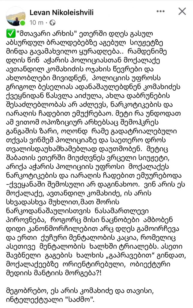 “✅”მთავარი არხის” ეთერში დღეს გასულ აბსურდულ ბრალდებებზე აგებულ სიუჟეტზე მინდა გავამახვილო ყურადღება.. რამდენიმე დღის წინ აჭარის პოლიციასთან მოქალაქე ავთანდილ კომახიძის ოჯახის წევრები და ახლობლები მივიდნენ, პოლიციის უფროსს გრიგოლ ბესელიას ადანაშაულებდნენ კომახიძეს ქვეყნიდან წასვლა აიძულა, ახლა დაბრუნების შესაძლებლობას არ აძლევს, ნარკოტიკების და იარაღის ჩადებით ემუქრებაო. მეტი რა უნდოდათ ამ ვითომ ოპოზიციურ არხებსაც შემოჰკრეს განგაშის ზარი, ოღონდ რამე გადატრიალებული თქვას ვინმემ პოლიციაზე და საეთერო დროს თვალისდაუხამხამებლად დაუთმობენ. მეტიც შაბათის ეთერში მიუძღვნეს ვრცელი სიუჟეტი, არიქა აჭარის პოლიციის უფროსი მოქალაქეს ნარკოტიკების და იარაღის ჩადებით ემუურებოდა -ქვეყანაში შემოსული არ დაგინახოო. ვინ არის ეს მოქალაქე, ავთანდილ კომახიძე, ის არის სხვადასხვა მუხლით,მათ შორის ნარკოდანაშაულისთვის ნასამართლევი პიროვნება, როგორც მისი ნაცნობები ამბობენ დიდი კანონმორჩილებით არც დღეს გამოირჩევა და ერთი ქუჩური მენტალობის კაცია, რომელიც ასეთივე მენტალობის ხალხში ტრიალებს. ასეთი შავბნელი გაგების ხალხის „გაპრავებით“ გინდათ, მოქალაქეებზე ორიენტირებული, ობიექტური მედიის მანტიის მორგება?!