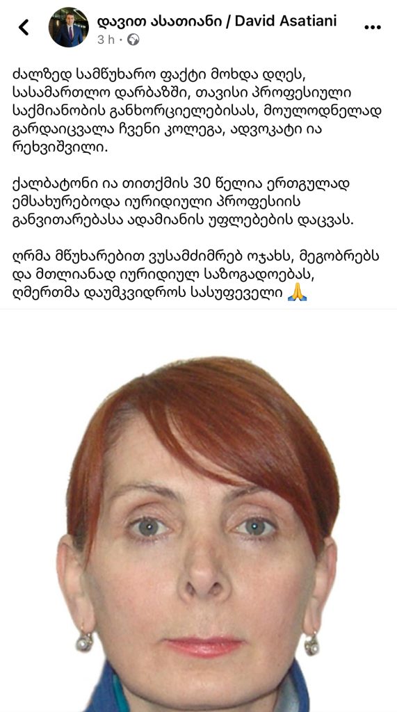 „ძალზედ სამწუხარო ფაქტი მოხდა დღეს, სასამართლო დარბაზში, თავისი პროფესიული საქმიანობის განხორციელებისას, მოულოდნელად გარდაიცვალა ჩვენი კოლეგა, ადვოკატი ია რეხვიაშვილი.