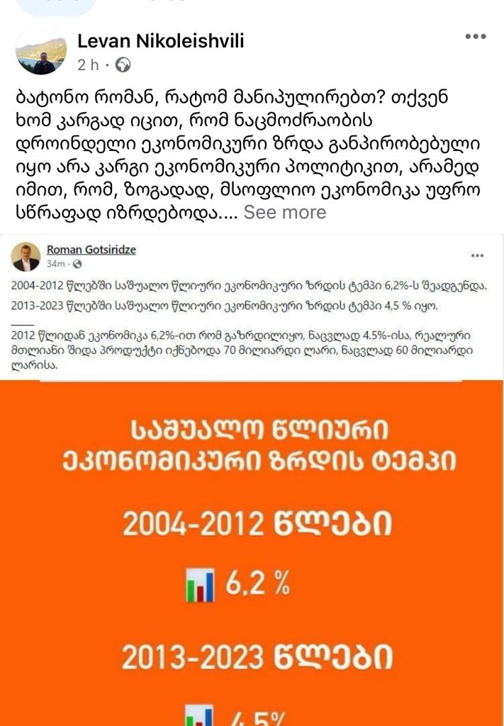ბატონო რომან, რატომ მანიპულირებთ? თქვენ ხომ კარგად იცით, რომ ნაცმოძრაობის დროინდელი ეკონომიკური ზრდა განპირობებული იყო არა კარგი ეკონომიკური პოლიტიკით, არამედ იმით, რომ, ზოგადად, მსოფლიო ეკონომიკა უფრო სწრაფად იზრდებოდა, – ასე ეხმიანება ექსპერტი ლევან ნიკოლეიშვილი ოპოზიციონერი დეპუტატის, რომან გოცირიძის განცხადებას, რომლის თანახმად 2004-2012 წლებში საშუალო წლიური ეკონომიკური ზრდის ტემპი 6,2%-ს, ხოლო 2013-2023 წლებში 4,5%-ს შეადგენდა.