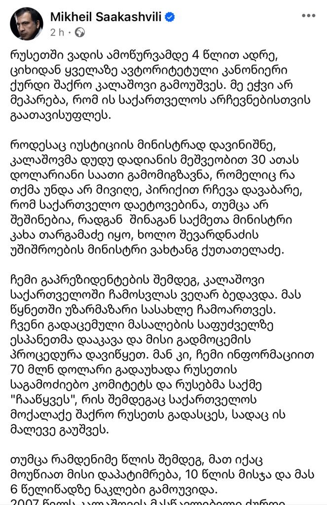 რუსები ახლაც თვლიან, რომ არჩევნებზე შეუძლიათ დიდი სიურპრიზები მიიღონ და კალაშოვს ქართული კრიმინალური სამყაროს მართვას დაავალებენ. არ გამოვრიცხავ, რომ ერთ-ერთი დავალება ციხეში ჩემი საკითხის საბოლოო “მოგვარება” იყოს“, – წერია მიხეილ სააკაშვილის განცხადებაში.