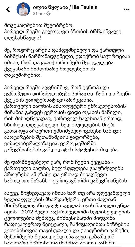 „მოგესალმებით მეგობრებო, პირველ რიგში გილოცავთ ბზობის ბრწყინვალე დღესასწაულს! მე, როგორც არქის დამფუძნებელი და ქართული ბიზნესის წარმომადგენელი, ვფიქრობ საჭიროებაა იმისა, რომ დავაფიქსირო ჩემი შეხედულება ქვეყანაში მიმდინარე მოვლენებთან დაკავშირებით.