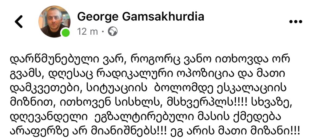 “როგორც ვანო ითხოვდა ორ გვამს, დღესაც რადიკალური ოპოზიცია სიტუაციის ბოლომდე ესკალაციის მიზნით, ითხოვენ მსხვერპლს”