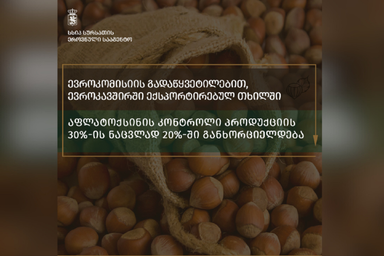 ქართულ თხილში აფლატოქსინის სახელმწიფო კონტროლის სისტემის ეფექტიანობის დადგენის მიზნით, მიმდინარე წლის დასაწყისში სურსათის ეროვნულმა სააგენტომ ევროკომისიის აუდიტორებს წარუდგინა ინფორმაცია საექსპორტოდ განკუთვნილი თხილისა და მისგან წარმოებული პროდუქციის შემოწმების სრული ჯაჭვის შესახებ. ევროკომისიის ჯანმრთელობისა და სურსათის უვნებლობის გენერალური დირექტორატისგან (DG SANTE) სახელმწიფო სისტემამ დადებითი შეფასება მიიღო.