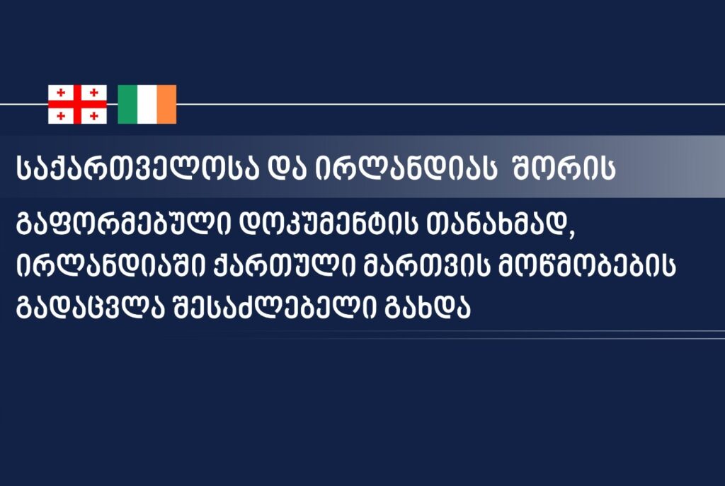 უწყების ცნობით, ურთიერთგაგების მემორანდუმი ძალაშია 2024 წლის 25 ივნისიდან, რაც იმას ნიშნავს, რომ საქართველოსა და ირლანდიის მიერ გაცემული მოქმედი მართვის მოწმობის მფლობელებს, თეორიული ან პრაქტიკული გამოცდის ჩაბარების გარეშე შეუძლიათ გადაცვალონ თანაბარი ძალის მქონე მართვის მოწმობაში მათი მუდმივი საცხოვრებელი ადგილის შესაბამისად.