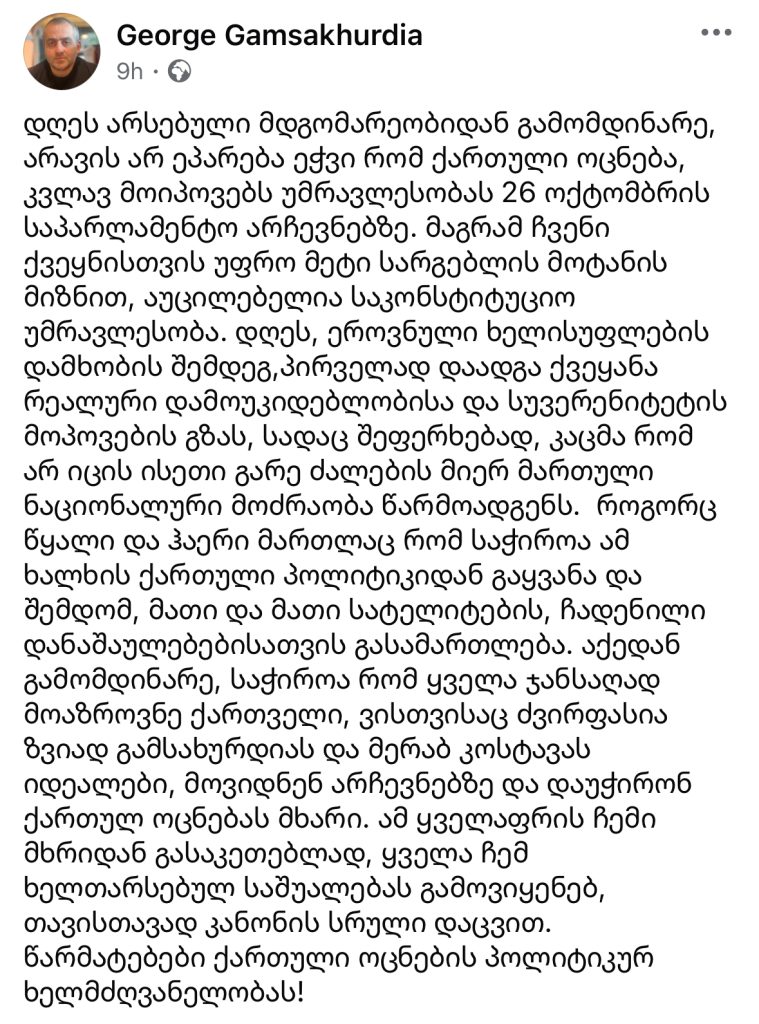 დღეს, ეროვნული ხელისუფლების დამხობის შემდეგ, პირველად დაადგა ქვეყანა რეალური დამოუკიდებლობისა და სუვერენიტეტის მოპოვების გზას, სადაც შეფერხებად, კაცმა რომ არ იცის ისეთი გარე ძალების მიერ მართული ნაციონალური მოძრაობა წარმოადგენს. როგორც წყალი და ჰაერი მართლაც რომ საჭიროა ამ ხალხის ქართული პოლიტიკიდან გაყვანა და შემდგომ, მათი და მათი სატელიტების, ჩადენილი დანაშაულებებისათვის გასამართლება. აქედან გამომდინარე, საჭიროა რომ ყველა ჯანსაღად მოაზროვნე ქართველი, ვისთვისაც ძვირფასია ზვიად გამსახურდიას და მერაბ კოსტავას იდეალები, მოვიდნენ არჩევნებზე და დაუჭირონ „ქართულ ოცნებას“ მხარი. ამ ყველაფრის ჩემი მხრიდან გასაკეთებლად, ყველა ჩემ ხელთარსებულ საშუალებას გამოვიყენებ, თავისთავად კანონის სრული დაცვით. წარმატებები „ქართული ოცნების“ პოლიტიკურ ხელმძღვანელობას!“, – წერს იგი.