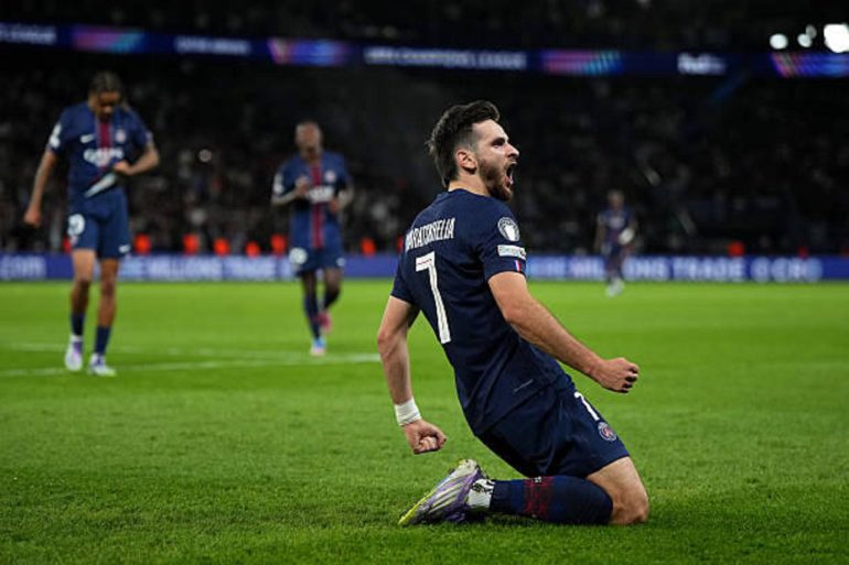პარიზული გუნდის მწვრთნელმა ლუის ენრიკემ წინა მატჩში ტრავმირებული ხვიჩა კვარაცხელია სასტარტოში დააყენა და ქართველმა იმედები არ გაუცრუა. მასპინძლები თავიდანვე დაეუფლნენ უპირატესობას, დიდი ძალებით შეუტიეს და მარკინიოსმა დააწინაურა. შემდეგ შესანიშნავი შანსები მენდეშმა და ბარკოლამ ვერ გამოიყენეს, ჰაკიმის დარტყმული ბურთი ძელს მოხვდა, ბარკოლას გოლი თამაშგარეს გამო არ ჩაითვალა, 39-ე წუთზე კი ჩინებული დრიბლინგის შედეგად კარნეზეკის კარი შორიდან „კვარამ“ დალაშქრა. ბოლოს პსჟ-ს კიდევ ერთი დიდებული შანსი მიეცა, მაგრამ ბარკოლას პენალტი მეკარემ აუღო და პირველი ტაიმი 2:0 დასრულდა.