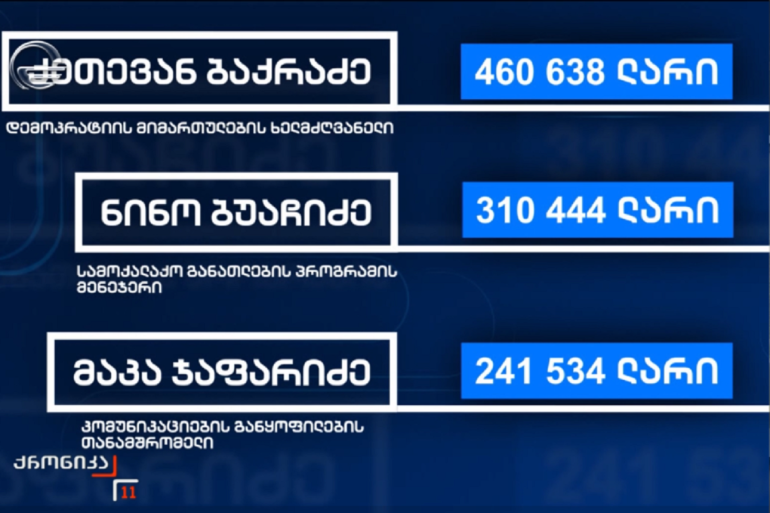 კონკრეტულად, დემოკრატიის მიმართულების ხელმძღვანელს ქეთევან ბაქრაძეს – 460 ათას 638 ლარი, სამოქალაქო განათლების პროგრამის მენეჯერს ნინო ბუაჩიძეს – 310 ათას 444 ლარი, კომუნიკაციების განყოფილების თანამშრომელს მაკა ჯაფარიძეს – 241 ათას 534 ლარი. თანხა ჩაირიცხა ბანგკოკიდან, ისევე, როგორც ახალი სქემის მონაწილე უნივერსიტეტებს და შპს-ებს.