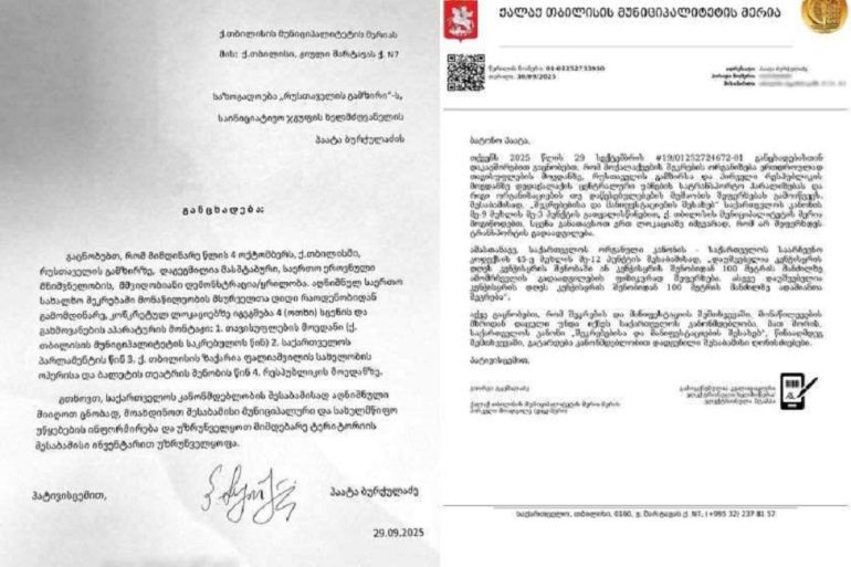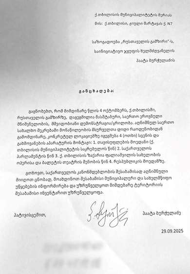 „საზოგადოების მაღალი ინტერესის გათვალისწინებით გაცნობებთ, რომ მიმდინარე წლის 29 სექტემბერს, საზოგადოება „რუსთაველის გამზირის“ საინიციატივო ჯგუფის ხელმძღვანელის, პაატა ბურჭულაძის სახელით, თბილისის მერიის ადმინისტრაციაში შემოვიდა წერილი, რომლის შინაარსს, ისევე როგორც საპასუხო გზავნილს, ვასაჯაროებთ.