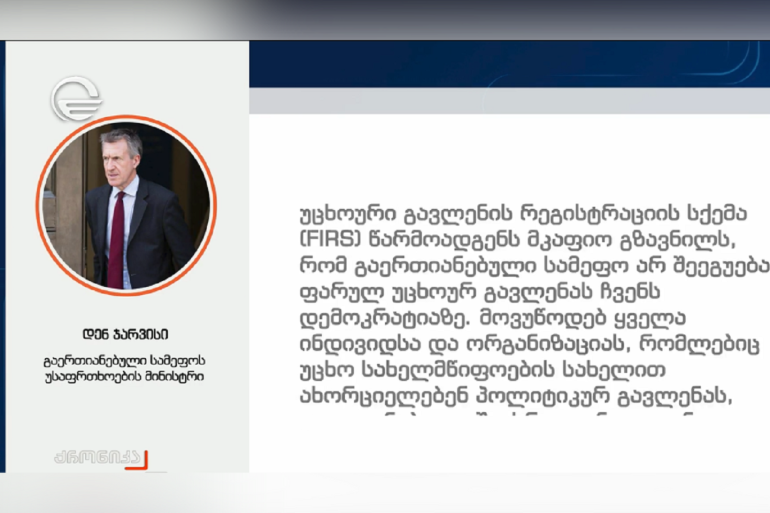 უცხოური გავლენის რეგისტრაციის სქემა წარმოადგენს მკაფიო გზავნილს, რომ გაერთიანებული სამეფო არ შეეგუება ფარულ უცხოურ გავლენას ჩვენს დემოკრატიაზე, – აცხადებს გაერთიანებული სამეფოს უსაფრთხოების მინისტრი დენ ჯარვისი „უცხოური გავლენის რეგისტრაციის სქემასთან“ დაკავშირებით, რომელიც პირველ ოქტომბერს ამოქმედდა.