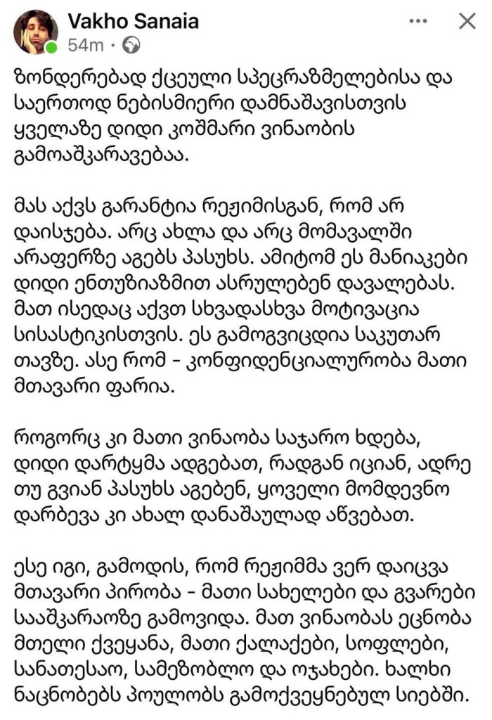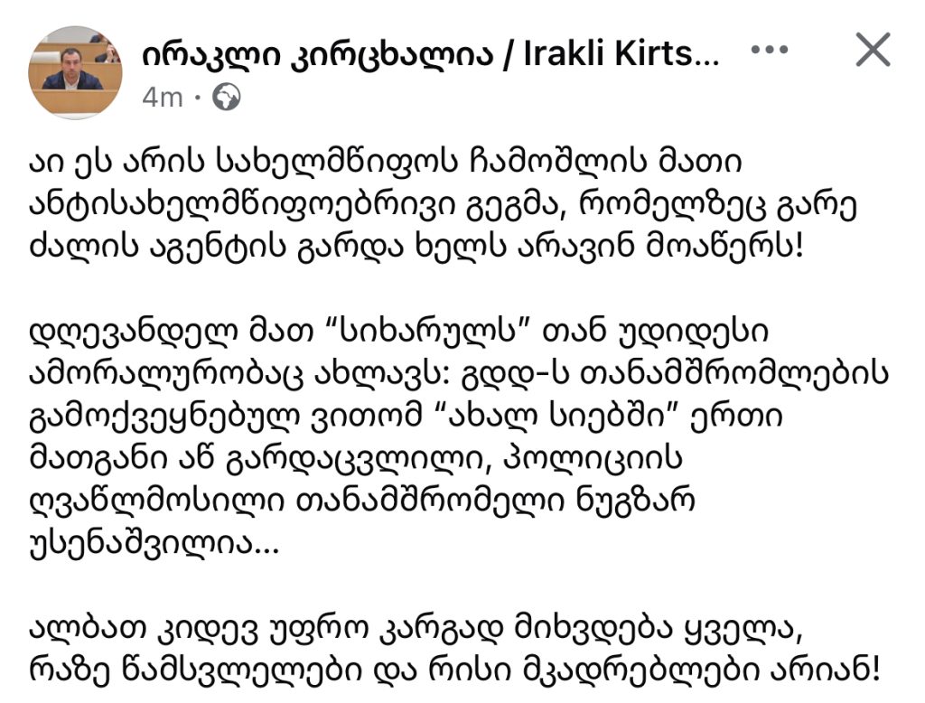ირაკლი კირცხალია სოციალურ ქსელში პოსტს აქვეყნებს.