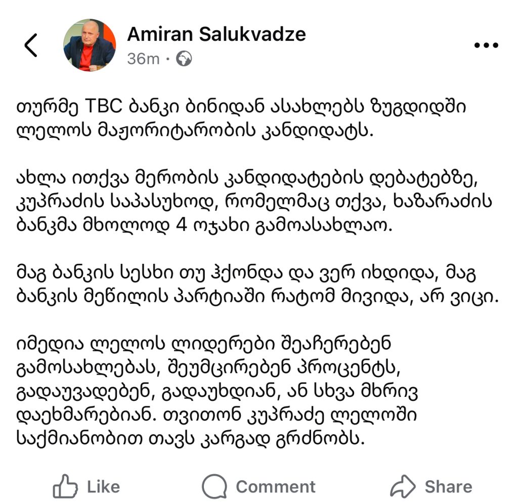ანალიტიკოსი ამირან სალუქვაძე სოციალურ ქსელში პოსტს აქვეყნებს.