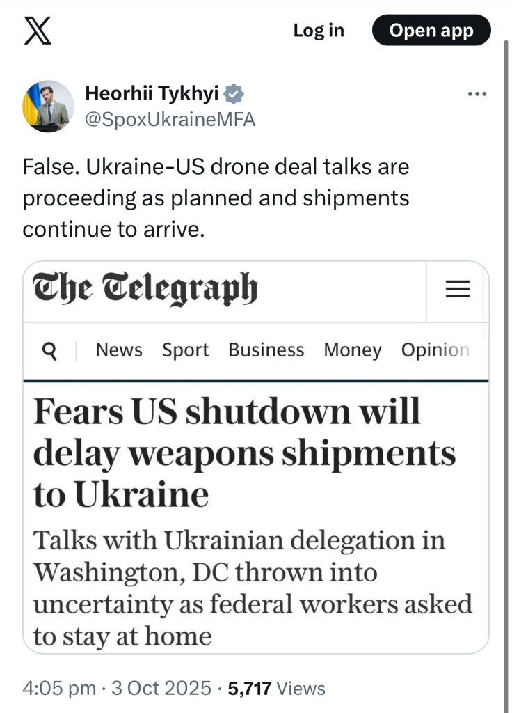 „სიცრუეა. უკრაინასა და აშშ-ს შორის მოლაპარაკებები უპილოტო საფრენი აპარატების შესახებ გეგმის მიხედვით მიმდინარეობს. მიწოდება გრძელდება“, – დაწერა ტიხიმ.