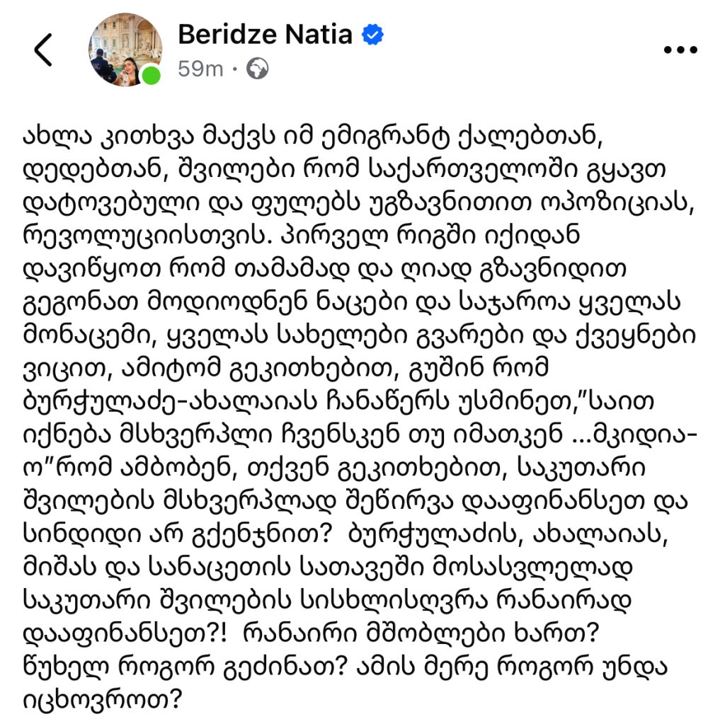 ნათია ბერიძე: მიშას და ახალაიას სათავეში მოსასვლელად საკუთარი შვილების სისხლისღვრა რანაირად დააფინანსეთ, რანაირი მშობლები ხართ