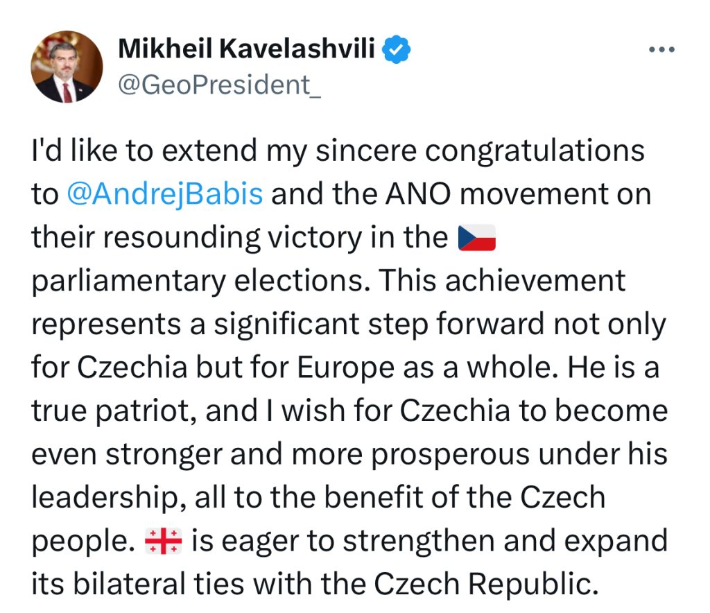 “მინდა გულწრფელად მივულოცო ანდრეი ბაბიშს და მოძრაობას „ანო“ ჩეხეთის რესპუბლიკის საპარლამენტო არჩევნებში დამაჯერებელი გამარჯვება”