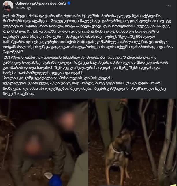 ამიტომაც, ვფიქრობ, ამ მუქარაზე მეტად მაჩალიკაშვილის მიერ დადგმულ სპექტაკლად მოხსენიებული იმ ჩანაწერის შინაარსია მნიშვნელოვანი, რომელიც სახელმწიფო უსაფრთხოების სამსახურმა გაავრცელა, რომელშიც პირდაპირ ისმის, რომ ბრალდებული თავისივე პირით აბარებს ანგარიშს დამკვეთს ტყეში დამალული იმ შეიარაღების შესახებ, რაც პრეზიდენტის სასახლის ხელში ჩაგდების მცდელობების პარალელურად, დივერსიული აქტების განხორციელებისთვის უნდა ყოფილიყო გამოყენებული.