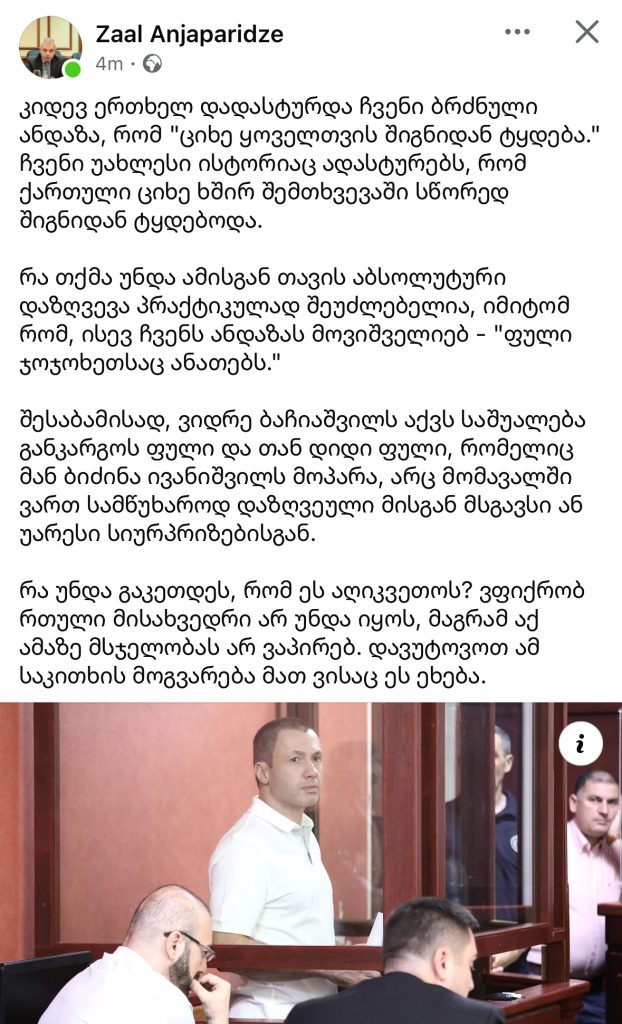 ზაალ ანჯაფარიძე სოციალურ ქსელში პოსტს აქვეყნებს.