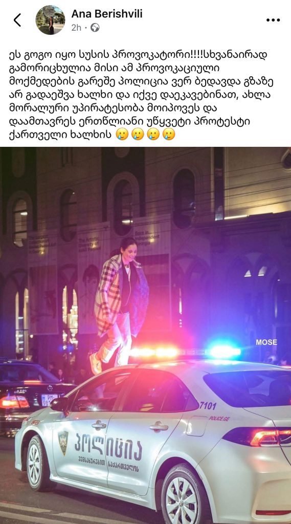 “ლელოს” ახალგაზრდული ორგანიზაციის წევრი ანა ბერიშვილი სოციალურ ქსელში აქციის იმ მონაწილის ფოტოს აქვეყნებს, რომელიც რუსთაველზე, პოლიციის ავტომანქანაზე ავიდა და ამბობს, რომ სუს-ის პროვოკატორია.