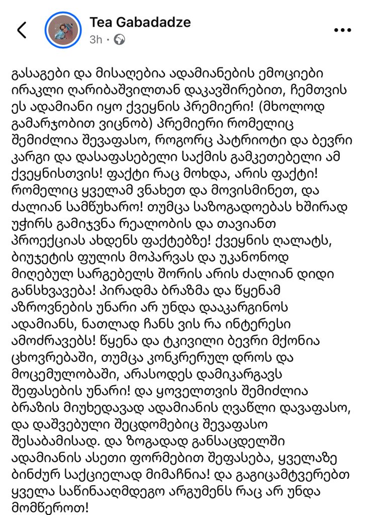 ”გასაგები და მისაღებია ადამიანების ემოციები ირაკლი ღარიბაშვილთან დაკავშირებით, ჩემთვის ეს ადამიანი იყო ქვეყნის პრემიერი! (მხოლოდ გამარჯობით ვიცნობ) პრემიერი რომელიც შემიძლია შევაფასო, როგორც პატრიოტი და ბევრი კარგი და დასაფასებელი საქმის გამკეთებელი ამ ქვეყნისთვის! ფაქტი რაც მოხდა, არის ფაქტი! რომელიც ყველამ ვნახეთ და მოვისმინეთ, და ძალიან სამწუხარო! თუმცა საზოგადოებას ხშირად უჭირს გამიჯვნა რეალობის და თავიანთ პროექციას ახდენს ფაქტებზე! ქვეყნის ღალატს, ბიუჯეტის ფულის მოპარვას და უკანონოდ მიღებულ სარგებელს შორის არის ძალიან დიდი განსხვავება! პირადმა ბრაზმა და წყენამ აზროვნების უნარი არ უნდა დააკარგინოს ადამიანს, ნათლად ჩანს ვის რა ინტერესი ამოძრავებს! წყენა და ტკივილი ბევრი მქონია ცხოვრებაში, თუმცა კონკრერულ დროს და მოცემულობაში, არასოდეს დამიკარგავს შეფასების უნარი! და ყოველთვის შემიძლია ბრაზის მიუხედავად ადამიანის ღვაწლი დავაფასო, და დაშვებული შეცდომებიც შევაფასო შესაბამისად. და ზოგადად განსაცდელში ადამიანის ასეთი ფორმებით შეფასება, ყველაზე ბინძურ საქციელად მიმაჩნია! და გაგიცამტვერებთ ყველა საწინააღმდეგო არგუმენს რაც არ უნდა მომწეროთ!”