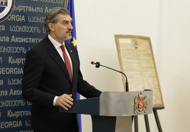„დაახლოებით ერთი წლის წინ დავდე ფიცი ღვთისა და ერის წინაშე, რომ დავიცავდი კონსტიტუციას. ეს არის ჩვენი ძირითადი, უზენაესი კანონი, რომელსაც საქართველოს თითოეული მოქალაქე უნდა იცავდეს. მით უმეტეს დღეს ჩვენი ქვეყანა საკვანძო ეტაპს გადის, ჩვენი დამოუკიდებლობის აღდგენის შემდეგ ყველა ვხედავთ გარშემო სიტუაციას, გამოწვევებს და განსაკუთრებულად მნიშვნელოვანია კანონთან მიმართებაში თითოეული ინსტიტუციის და ასევე თითოეული მოქალაქის დამოკიდებულება. ვხედავთ როგორი შემოტევებია, პირდაპირი მნიშვნელობით კონსტიტუციის, კანონის დარღვევასთან დაკავშირებით , ამიტომაც იმ ადამიანებს,ვისაც ხელგვეწიფება, რომ დავიცვათ სახელმწიფო, სახელმწიფოს დაცვა პირველ რიგში ნიშნავს კონსტიტუციის დაცვას, ეს არის ჩვენი უზენაესი ვალდებულება. მინდა გიორგის და თითოეულ თქვენგანს კიდევ ერთხელ გისურვოთ წარმატებები“,- განაცხადა საქართველოს პრეზიდენტმა.