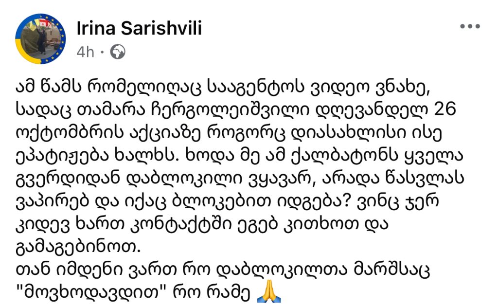 “ამ წამს რომელიღაც სააგენტოს ვიდეო ვნახე, სადაც თამარა ჩერგოლეიშვილი დღევანდელ 26 ოქტომბრის აქციაზე როგორც დიასახლისი ისე ეპატიჟება ხალხს. ხოდა მე ამ ქალბატონს ყველა გვერდიდან დაბლოკილი ვყავარ, არადა წასვლას ვაპირებ და იქაც ბლოკებით იდგება? ვინც ჯერ კიდევ ხართ კონტაქტში ეგებ კითხოთ და გამაგებინოთ.