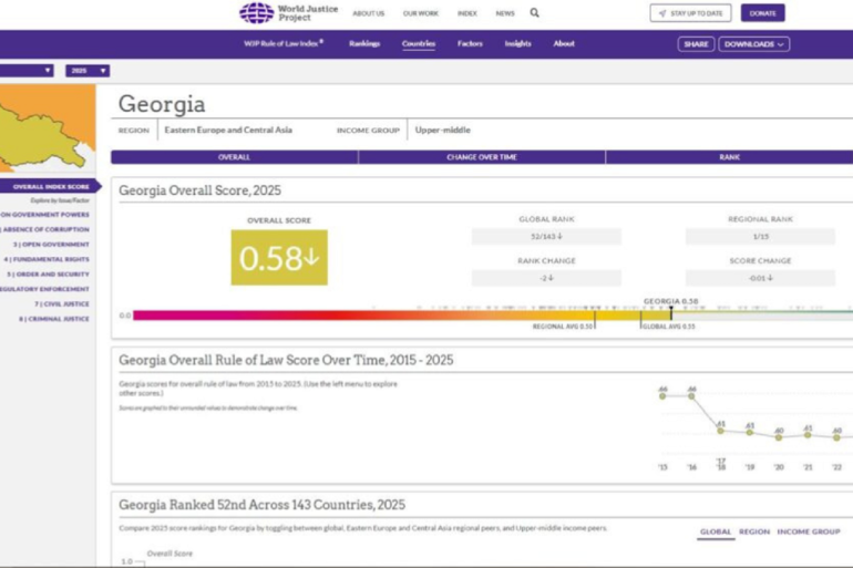 2025 წლის რეიტინგის მიხედვით, სისხლის სამართლის სისტემის, რეგულირების აღსრულების, ღია მთავრობისა და კორუფციის არსებობის ფაქტორებში საქართველო აღმოსავლეთ ევროპისა და ცენტრალური აზიის რეგიონის ქვეყნებს შორის პირველ ადგილზეა.