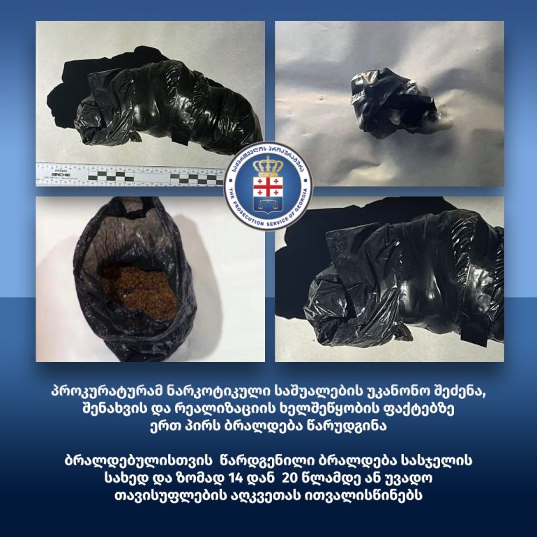 საქართველოს პროკურატურამ ნარკოტიკული საშუალების უკანონო შეძენა, შენახვის და რეალიზაციის ხელშეწყობის ფაქტზე ერთ პირს ბრალდება წარუდგინა.