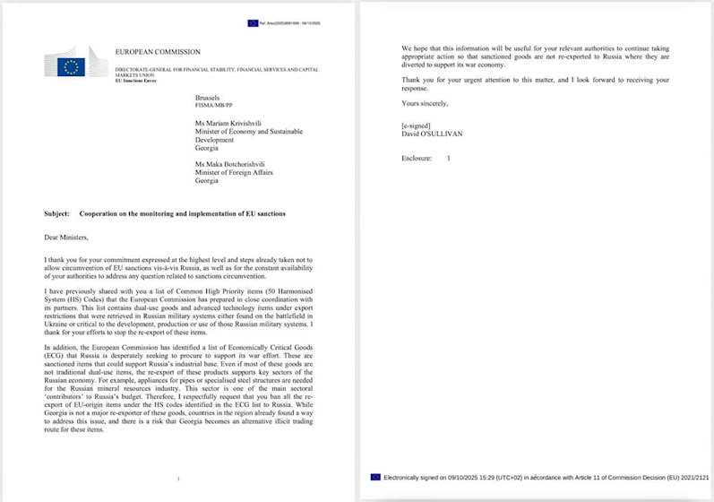 ევროკავშირის სანქციების შესახებ ევროკომისიის ფინანსური სტაბილურობის, ფინანსური სერვისებისა და კაპიტალის ბაზრების კავშირის გენერალური დირექტორატის წერილში, რომელსაც ხელს აწერს დევიდ ო’სალივანი, ასევე ხაზგასმულია საქართველოს ხელისუფლების მუდმივი ხელმისაწვდომობა სანქციების გვერდის ავლასთან დაკავშირებული საკითხების განსახილველად.