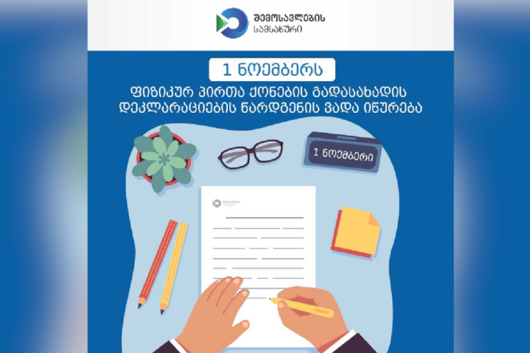 საქართველოს საგადასახადო კოდექსით განსაზღვრული, ფიზიკური პირის ქონების გადასახადის წლიური დეკლარაციის წარდგენის ვადა 3 ნოემბერს იწურება.