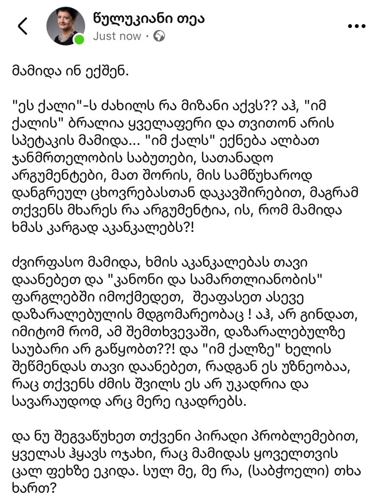 “ეს ქალი”-ს ძახილს რა მიზანი აქვს?? აჰ, “იმ ქალის” ბრალია ყველაფერი და თვითონ არის სპეტაკის მამიდა… “იმ ქალს” ექნება ალბათ ჯანმრთელობის საბუთები, სათანადო არგუმენტები, მათ შორის, მის სამწუხაროდ დანგრეულ ცხოვრებასთან დაკავშირებით, მაგრამ თქვენს მხარეს რა არგუმენტია, ის, რომ მამიდა ხმას კარგად აკანკალებს?!