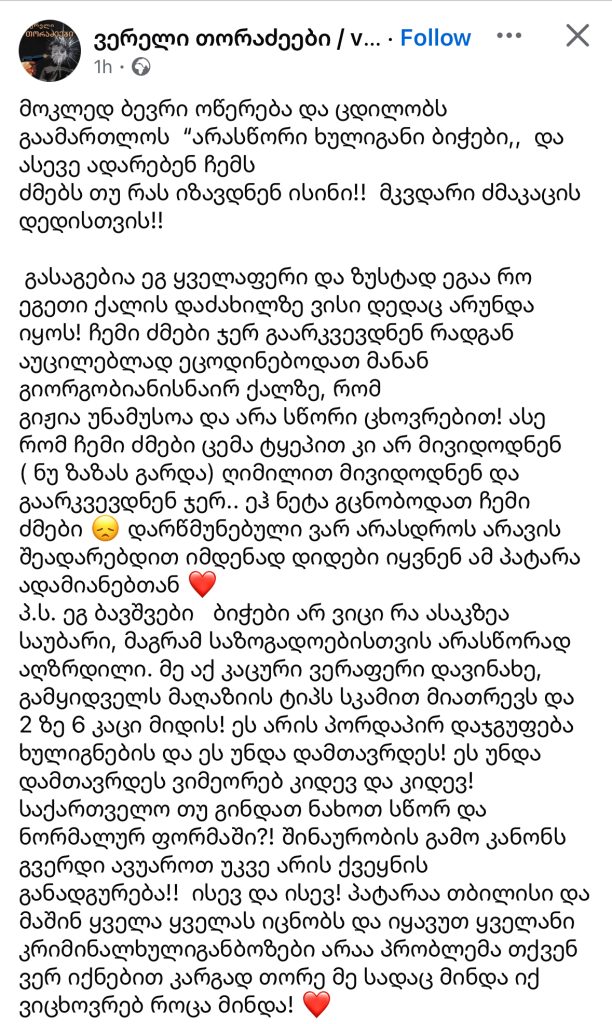 პ.ს. ეგ ბავშვები ბიჭები არ ვიცი რა ასაკზეა საუბარი, მაგრამ საზოგადოებისთვის არასწორად აღზრდილი. მე აქ კაცური ვერაფერი დავინახე, გამყიდველს მაღაზიის ტიპს სკამით მიათრევს და 2 ზე 6 კაცი მიდის! ეს არის პორდაპირ დაჯგუფება ხულიგნების და ეს უნდა დამთავრდეს! ეს უნდა დამთავრდეს ვიმეორებ კიდევ და კიდევ! საქართველო თუ გინდათ ნახოთ სწორ და ნორმალურ ფორმაში?! შინაურობის გამო კანონს გვერდი ავუაროთ უკვე არის ქვეყნის განადგურება!! ისევ და ისევ! პატარაა თბილისი და მაშინ ყველა ყველას იცნობს და იყავუთ ყველანი კრიმინალხულიგანბოზები არაა პრობლემა თქვენ ვერ იქნებით კარგად თორე მე სადაც მინდა იქ ვიცხოვრებ როცა მინდა! ❤️”