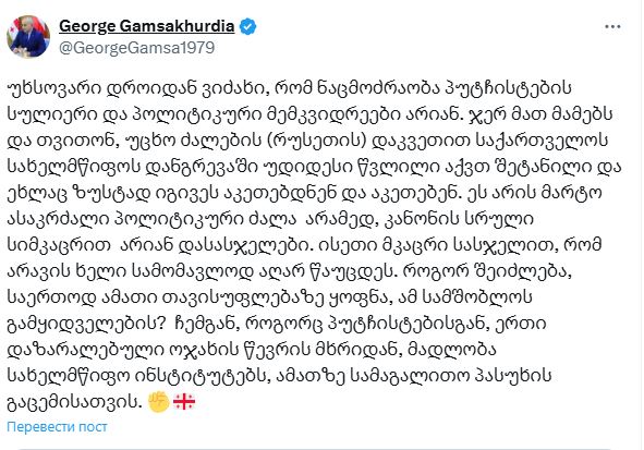 „უხსოვარი დროიდან ვიძახი, რომ ნაცმოძრაობა პუტჩისტების სულიერი და პოლიტიკური მემკვიდრეები არიან. ჯერ მათ მამებს და თვითონ, უცხო ძალების (რუსეთის) დაკვეთით საქართველოს სახელმწიფოს დანგრევაში უდიდესი წვლილი აქვთ შეტანილი და ეხლაც ზუსტად იგივეს აკეთებდნენ და აკეთებენ. ეს არის არა მარტო ასაკრძალი პოლიტიკური ძალა არამედ, კანონის სრული სიმკაცრით არიან დასასჯელები. ისეთი მკაცრი სასჯელით, რომ არავის ხელი სამომავლოდ აღარ წაუცდეს. როგორ შეიძლება, საერთოდ ამათი თავისუფლებაზე ყოფნა, ამ სამშობლოს გამყიდველების? ჩემგან, როგორც პუტჩისტებისგან, ერთი დაზარალებული ოჯახის წევრის მხრიდან, მადლობა სახელმწიფო ინსტიტუტებს, ამათზე სამაგალითო პასუხის გაცემისათვის“- წერს გამსახურდია X-ზე.