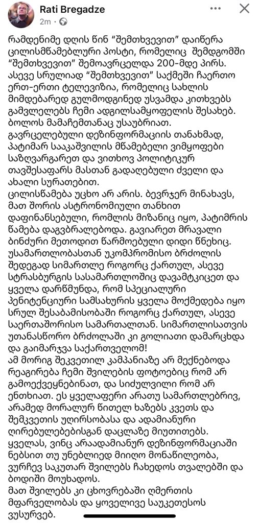 ამ მორიგ შეკვეთილ კამპანიაზე არ მექნებოდა რეაგირება ჩემი შვილების ფოტოებიც რომ არ გამოექვეყნებინათ, და სიძულვილი რომ არ ენთხიათ. ეს ყველაფერი არათუ სამართლებრივ, არამედ მორალურ წითელ ხაზებს კვეთს და შემკვეთის უღირსობასა და ადამიანური ღირებულებებისგან დაცლაზე მიუთითებს.