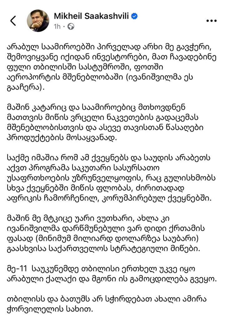 “რადგან 6.5 მილიარდიანი ინვესტიციის წინააღმდეგ აგორებულ კამპანიაში სააკაშვილი აქტიურად ჩაერთო და იმ დეზინფორმაციის ნაწილი გახდა, რაც ჩვენი ქვეყნის წინააღმდეგ მიმდინარეობს და მიზნად ინვესტიციის ჩაშლას, შესაბამისად ქვეყნის ეკონომიკის დაზიანებას ისახავს, არ შემიძლია ერთი ისტორია არ გავიხსენო”- წერს ექსპერტი ედიშერ გვენეტაძე სოციალურ ქსელში და აზიარებს მიხეილ სააკაშვილის სტატუსს, რომელიც ბიძინა ივანიშვილს საქართველოს სტრატეგიული მიწების გასხვისებაში სდებს ბრალს და ამბობს, რომ “თბილისს და ბათუმს არ სჭირდებათ ახალი ამირა ჭორვილელის სახით”.