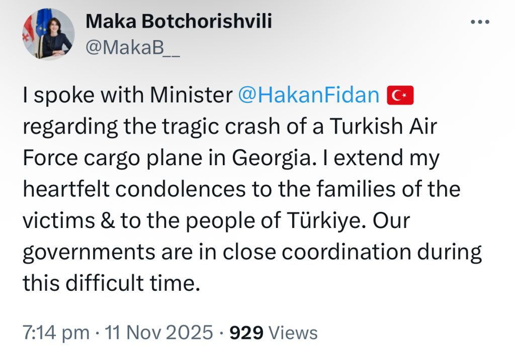 მაკა ბოჭორიშვილი თურქ კოლეგასთან, ჰაკან ფიდასთან სატელეფონო საუბრის შესახებ სოციალურ ქსელში წერს. საქართველოს საგარეო უწყების ხელმძღვანელმა X-ზე გამოქვეყნებულ პოსტში ავიაკატასტროფის შედეგად დაღუპულთა ოჯახებს და თურქეთის მოსახლეობას სამძიმარი გამოუცხადა.