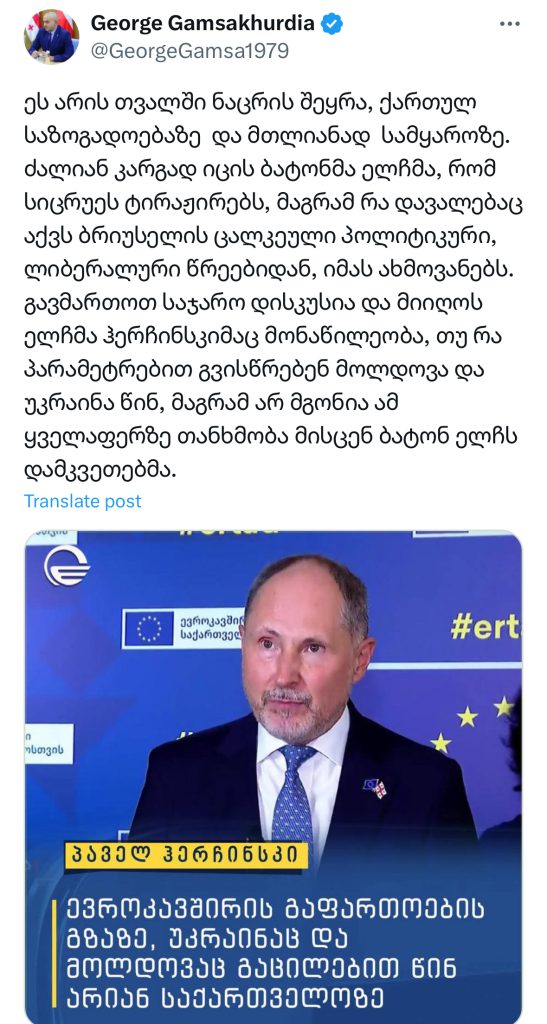 გიორგი გამსახურდია, ევროკავშირის ელჩის, პაველ ჰერჩინსკის განცხადებას, რომელმაც აღნიშნა, რომ ევროკავშირის გაფართოების გზაზე, უკრაინაც და მოლდოვაც გაცილებით წინ არიან საქართველოზე, X-ზე ეხმიანება.