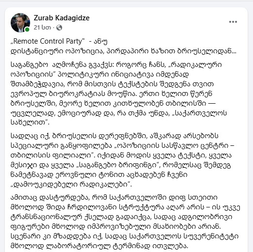P.S. თანამედროვე ტექნოლოგიებმა პოლიტიკაშიც დაამკვიდრა ახალი ფორმატი – „დისტანციური ოპოზიცია”, – წერს ზურაბ ქადაგიძე.
